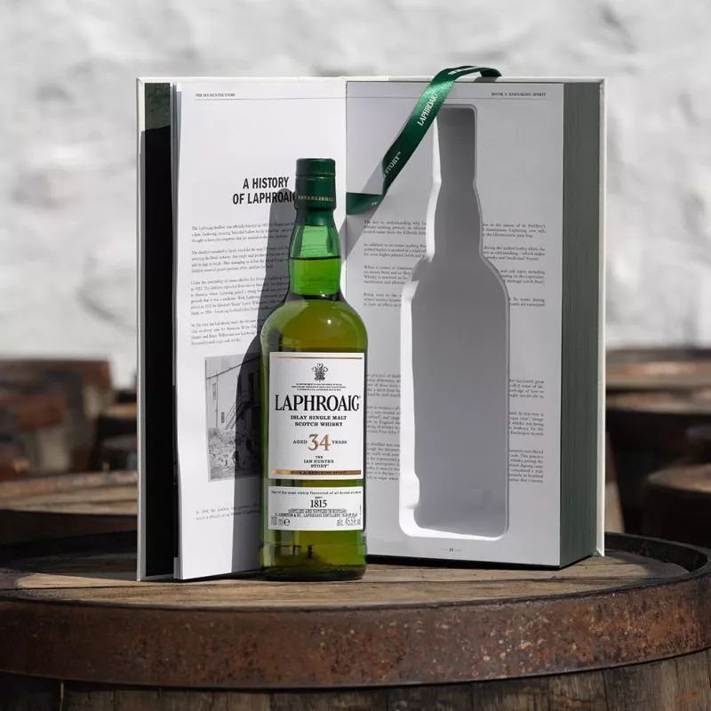 This 34-year-old ex-bourbon barrel matured single malt is the fifth and final release in Laphroaig’s series of rare and collectable aged whiskies to celebrate the story of the legendary Ian Hunter.